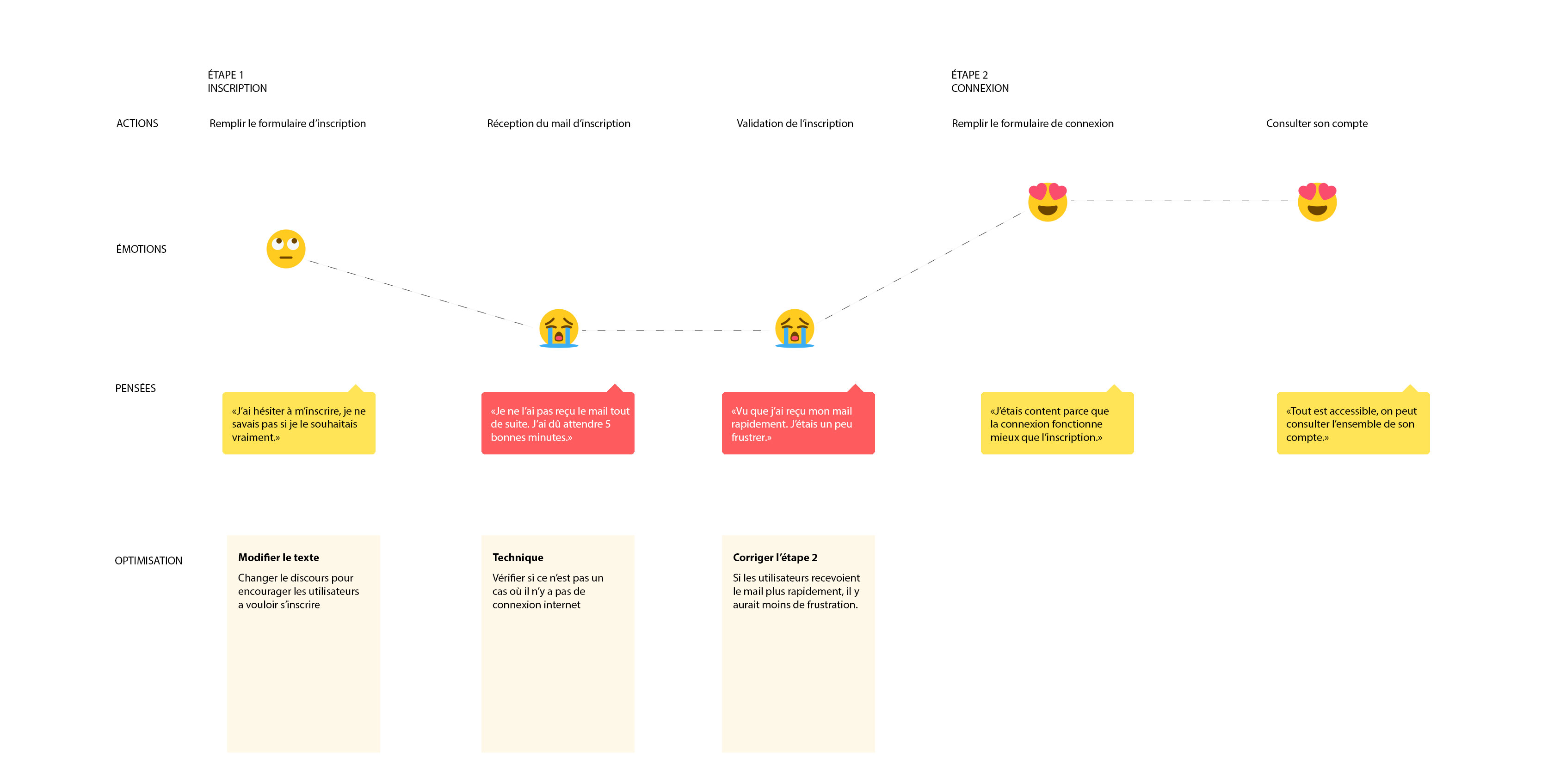 Pensez à enregistrer vos tests pour pouvoir faire une meilleure restitution. Une restitution par une expérience map est très explicite auprès des équipes. Elle permet de se rendre compte très rapidement qu’elles sont les étapes sur parcours qui sont à corrigé. Parfois, tout le parcours est remis en question. Cependant, il ne s’agit pas d’un échec puisque vous pourrez itérer grâce aux remarques que vous aurez collecter lors de vos tests utilisateur.